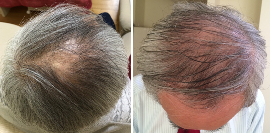 前回は7月に撮った写真でいくらか発毛しているようだと報告しました。 9月になると、鏡で見てもはっきりわかるようになってきました。 「やったぜ!!」こんな気分でした。 長続きしない私が、半年頑張ったら反応が出てきたのです。 体操の白井君の嬉しさとは比べものになりませんが、ささやかな成功体験です。 「やればできる。努力は人を裏切らない」松岡修造さんなら、きっとこう言ってくれると思います。 人には「頑張れ、根気よく続けて」と言っていますが、自分が当事者となると、続けるのは大変です。 でも一旦効果が見えると、俄然やる気が出るのも本当ですね。 患者さんにいつも、「毛髪を生やすには、お百姓さんになったつもりで大事に育てなさい」と言っています。 さらに「土地を耕し、肥料を撒いて、種を撒き、必要に応じて農薬を散布し、水を毎日欠かさず撒いて、今年はきっと良い作が得られますようにと神様にお願いしているはずです。都会の人では味わえないお百姓さんの気持ちがわかります」 と言っています。 「やるだけやって最後は神様にお任せする」こんな感じになっている人は、大抵治ってくるようです。 話は飛んでしまいましたが、9月の状況をお知らせします。 写真は9月22日のものです |